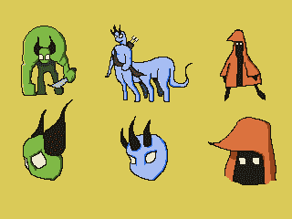 So after making these settings, I decided it was time to spend more time actually thinking about monster design (instead of y’know, being lazy and using a generic zombie for every enemy like I had been doing.) Based on some sketches I did earlier in the week, I came up with the following creatures that could presumably roam these forests (once again using the same color palette as before):