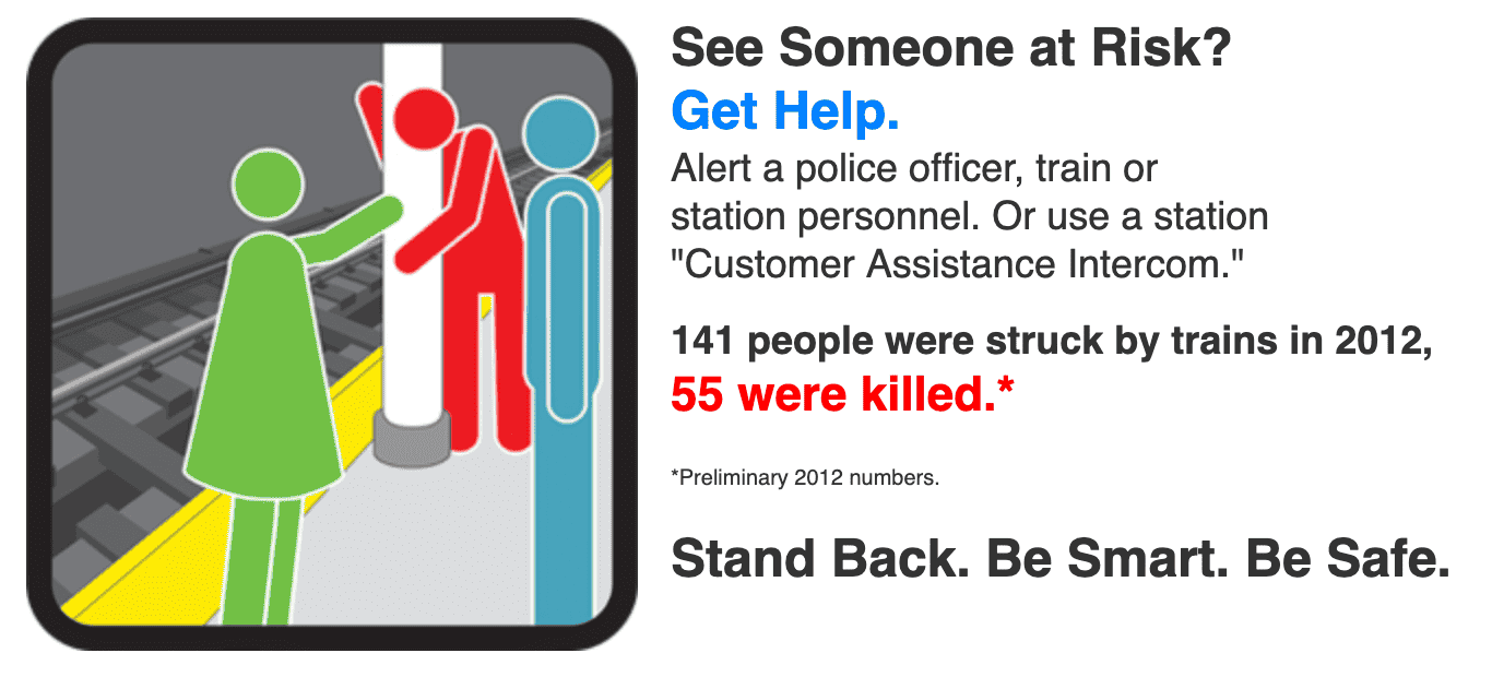 The posters in Fig 1 use vivid colors and carefully written copy in order to draw the attention of subway straphangers. In some cases, these are even translated to other languages to make them even more accessible, for example Fig. 2.