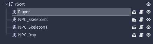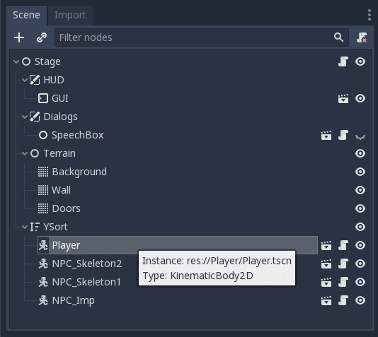 For example, Player is a node inside a larger tree called Stage that I can independently work on as its own root node in isolation: